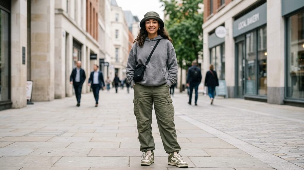Cargos, an oversized hoodie, and clean sneakers already look good on their own but adding a sharp hat from Blade Hats ties the whole thing together really fast. It does not feel forced and that is honestly the whole point.