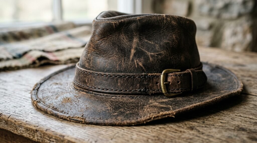 Master leather craftsman Al Stohlman wrote extensively about how leather absorbs the story of everything it goes through over time. The distressing and aging on these hats is not damage but an intentional layering of history directly into the material itself.
