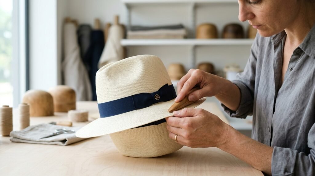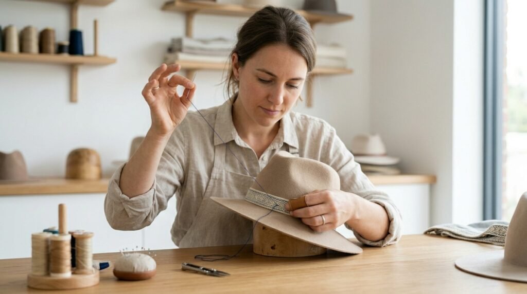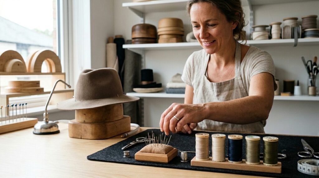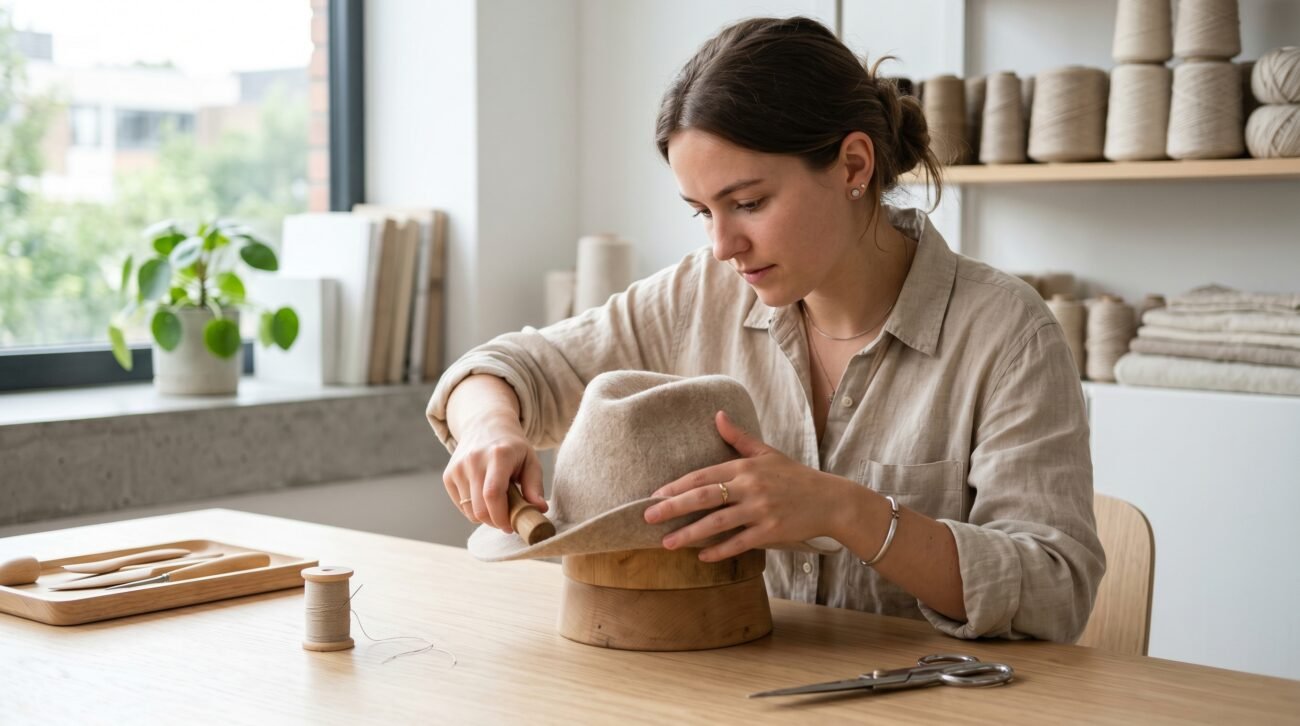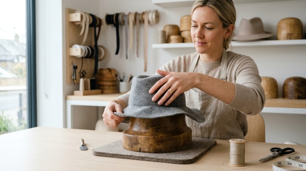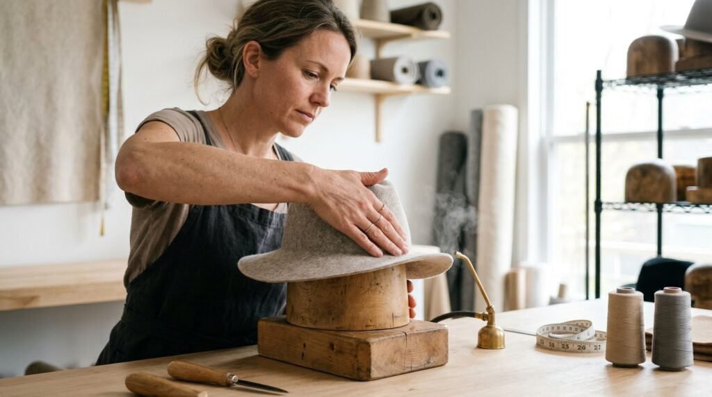 Out of nowhere, a good hat block can change everything. Steam steps in when shapes need softening. Needles quietly fix seams that refuse to lie flat. Stiffeners arrive just in time to hold the structure together.
