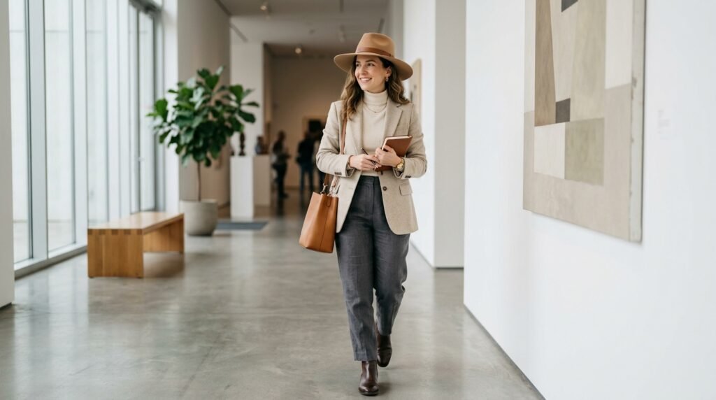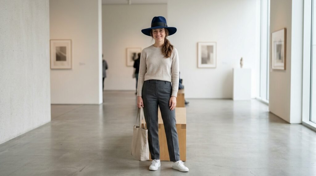 The hat is already doing a lot. Trying to match the whole outfit around it ends up looking like way too much effort. Simple clothes underneath let the hat do its job without competing with everything else.
