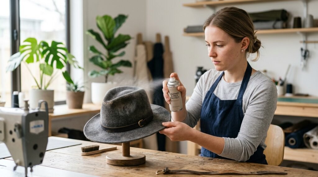 A light spray of fabric protector locks the finish in place and stops the hat ageing further than intended. It also helps the shape hold through regular wear going forward.