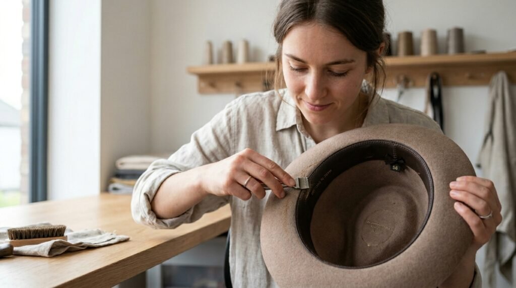 The inside of a genuinely old hat shows as much wear as the outside. Lightly sanding or staining the sweatband keeps the distress consistent from every angle rather than looking done from the outside only.