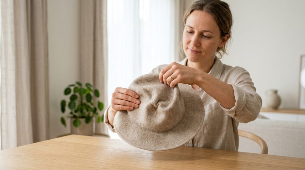 Scrunching the hat and reshaping it repeatedly while slightly damp breaks down the structure naturally. Small irregular creases and imperfections are exactly what makes the finished result look real.