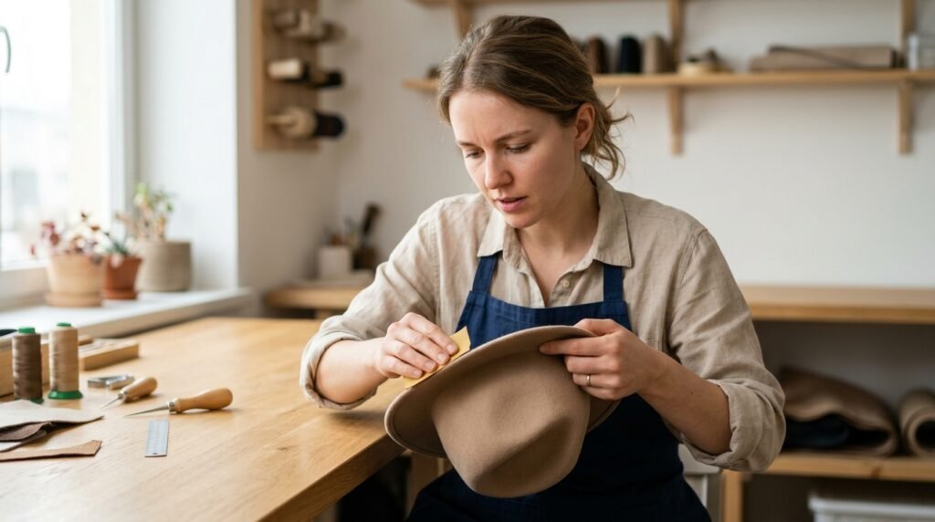 Reshaping the brim slightly by hand into a natural curve or irregular shape adds the kind of character that flat factory brims never have. Small imperfections are what separate a real worn look from a manufactured one.
