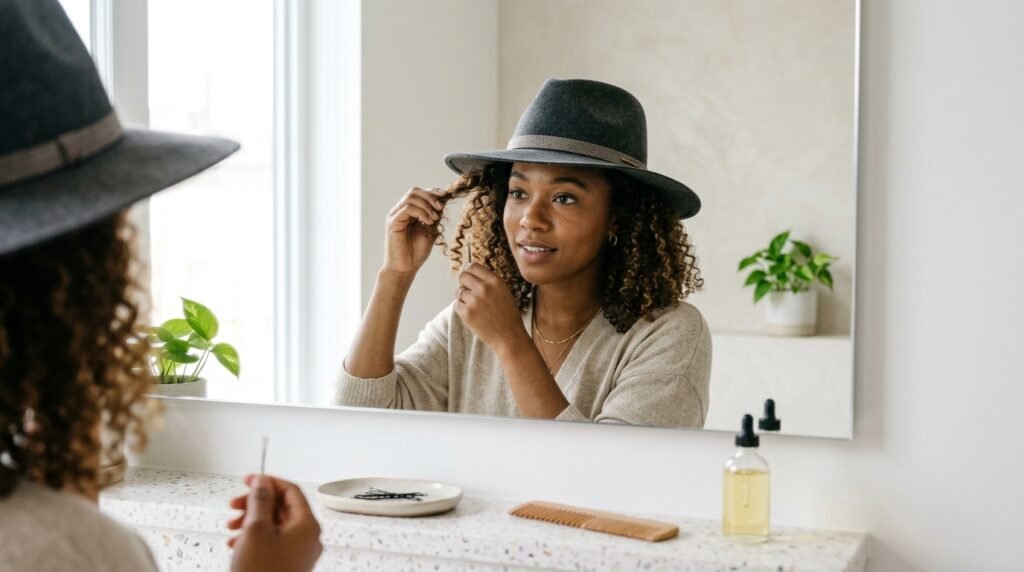 A statement hat sits at the top of the entire look and everything underneath gets noticed. Hair that works with the hat rather than fighting against it makes the whole thing land properly.