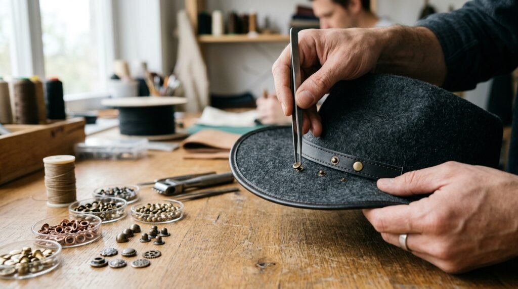Buckles, rivets, eyelets, clips. On a handcrafted hat these are chosen to match the overall piece rather than just being the cheapest option available. Those choices are what give it character.